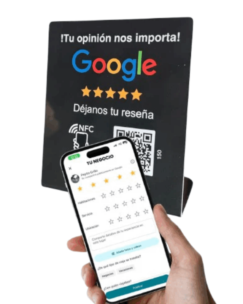 Olvídate de los códigos QR y los enlaces difíciles de escribir: con solo acercar un móvil, podrán acceder a tu web, redes sociales, carta digital o recibir una reseña en Google al instante. Fácil, rápido y efectivo para mejorar tu visibilidad y fidelizar clientes.